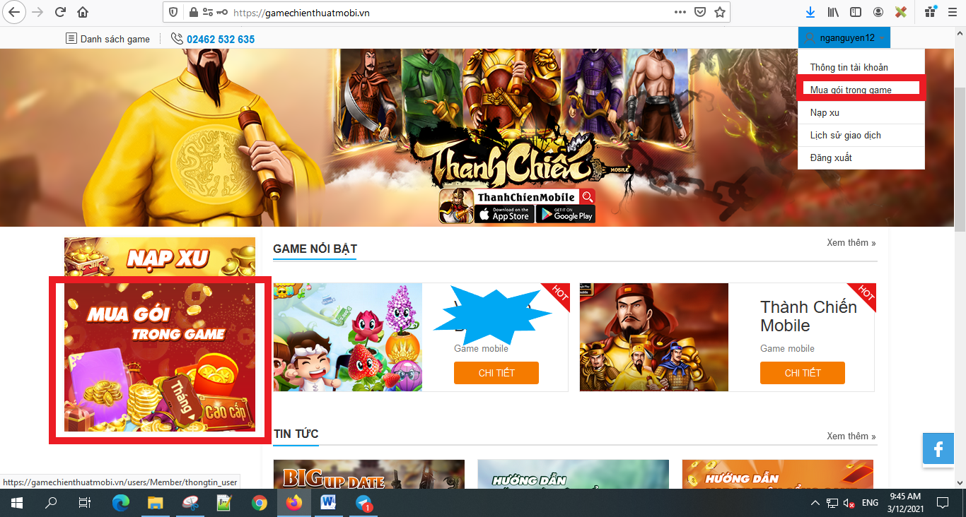 B3: Tại giao diện Mua gói trong game. Chọn game Thành Chiến.